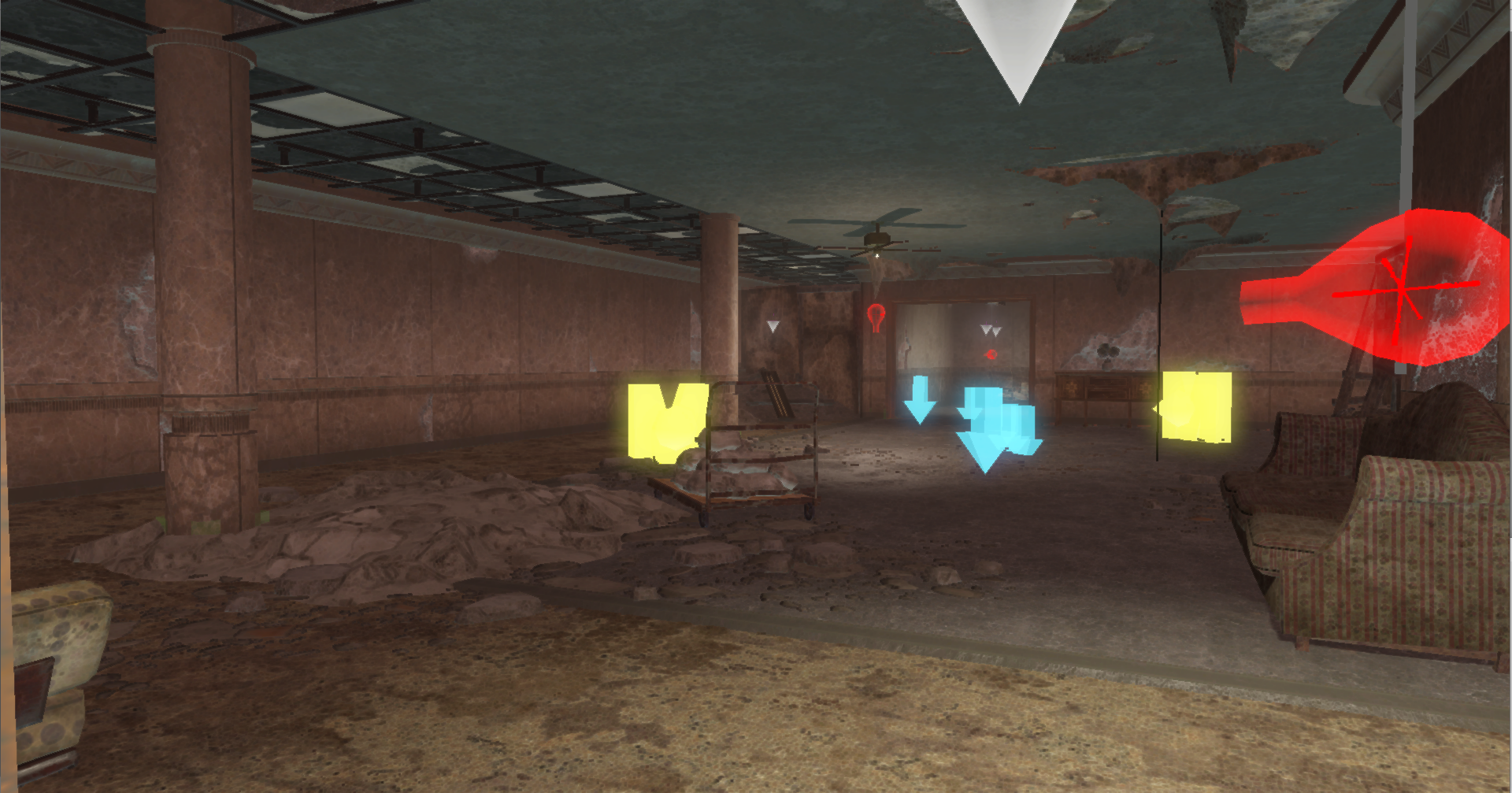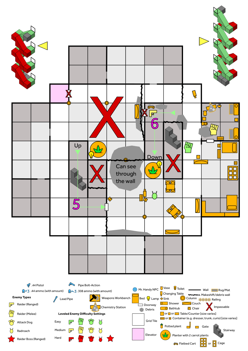 Broadly speaking, I wanted my content to expand on its surroundings without feeling tacked-on or forced. To achieve this, I took inspiration from Fallout’s theme of re-settling the post-war ruins as seen in Diamond City (a baseball field turned into a city) and Goodneighbor (now a safe haven for outcasts), and created a hotel taken over by raiders. From there, my goal was to design combat that took advantage of the environment in terms of cover, sightlines, and funnels. This mainly manifested in floors implicitly split into sections with plenty of corners and furniture for the player (and enemies) to use as cover.